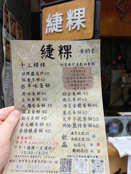 緁粿的品項有蘿蔔糕、古早味蛋餅、限量芋粿、飲品等)